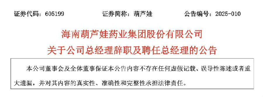 3月4日,海南葫蘆娃藥業(yè)發(fā)布公告稱,劉景萍辭去總經(jīng)理一職。