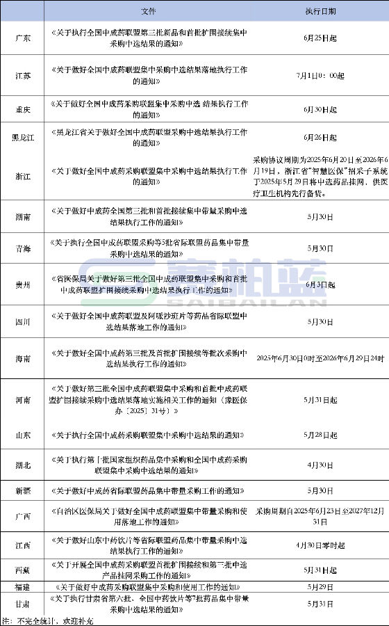 全國(guó)中成藥聯(lián)盟集采中選結(jié)果,多省陸續(xù)執(zhí)行。 01 大批中成藥 集采中選結(jié)果將落地 據(jù)賽柏藍(lán)梳理,目前至少已經(jīng)有19省/市/自治區(qū)發(fā)布全國(guó)中成藥聯(lián)盟第三批集采中選結(jié)果落地安排。 第三批全國(guó)中成藥集采已于2025年4月起在各省陸續(xù)落地執(zhí)行。湖北是最早執(zhí)行的省份之一,于4月30日開始執(zhí)行。其他省份的執(zhí)行時(shí)間有所不同,大多集中在5月末和6月執(zhí)行,具體如下。 全國(guó)中成藥聯(lián)盟集采共涉及20個(gè)產(chǎn)品組、95個(gè)產(chǎn)品,共有174個(gè)藥品中選。而后,又有8個(gè)產(chǎn)品復(fù)活擬中選,134個(gè)非報(bào)價(jià)代表品擬中選。 在不少省份發(fā)布的通知中,明確了采購(gòu)周期以及首個(gè)采購(gòu)周期,并對(duì)采購(gòu)價(jià)格何時(shí)切換作出了時(shí)間安排。 如廣東省在《關(guān)于執(zhí)行全國(guó)中成藥聯(lián)盟第三批新品和首批擴(kuò)圍接續(xù)集中采購(gòu)中選結(jié)果的通知》中稱,此次集中采購(gòu)周期為2025年6月25日至2027年12月31日,首年采購(gòu)周期為2025年6月25日至2026年6月24日。 廣東全國(guó)中成藥采購(gòu)聯(lián)盟第三批集采共有313個(gè)藥品中選,涉及近160家生產(chǎn)企業(yè);廣東全國(guó)中成藥采購(gòu)聯(lián)盟首批擴(kuò)圍接續(xù)集采共有492個(gè)藥品中選,涉及超170家生產(chǎn)企業(yè)。其要求,各市要在集采結(jié)果落地執(zhí)行第3個(gè)月組織對(duì)本市醫(yī)療機(jī)構(gòu)中選藥品進(jìn)院情況開展一輪問(wèn)題排查等。 江蘇省發(fā)布《關(guān)于做好全國(guó)中成藥聯(lián)盟集中采購(gòu)中選結(jié)果落地執(zhí)行工作的通知》指出,此次集采自2025年7月1日00:00起全省統(tǒng)一執(zhí)行。同時(shí),6月25日-6月30日,將進(jìn)行網(wǎng)簽采購(gòu)合同;6月26日起,江蘇省平臺(tái)切換采購(gòu)價(jià)格,中選企業(yè)本次集采目錄內(nèi)非中選清單產(chǎn)品同步暫停采購(gòu)。 02 中成藥集采 提質(zhì)擴(kuò)面 第三批中成藥集采通過(guò)規(guī)則優(yōu)化、強(qiáng)力監(jiān)管及差異化執(zhí)行,實(shí)現(xiàn)了降價(jià)與保量平衡。不完全梳理發(fā)現(xiàn),今年來(lái),全國(guó)多地已經(jīng)進(jìn)行了多個(gè)批次的中成藥單省/省際聯(lián)盟集采。 如安徽省2024年度中成藥集采結(jié)果已經(jīng)公布,11個(gè)藥品中選;廣東聯(lián)盟金蓮花膠囊等中成藥集中帶量采購(gòu),323個(gè)藥品中選,其中175個(gè)藥中選,148個(gè)藥限量中選。 廣東聯(lián)盟金蓮花膠囊等中成藥集中帶量采購(gòu)的品種是廣東聯(lián)盟清開靈等中成藥集中帶量采購(gòu)采購(gòu)清單涉及的藥品劑型,與全國(guó)中成藥聯(lián)盟集中帶量采購(gòu)第三批和首批擴(kuò)圍接續(xù)采購(gòu)品種范圍重疊的藥品劑型不列入其中,廣東聯(lián)盟清開靈等中成藥集中帶量采購(gòu)共有53個(gè)品種中選。 自2020年6月金華市藥品耗材帶量集中采購(gòu)聯(lián)盟委員會(huì)關(guān)于開展金華市第二批藥品帶量采購(gòu)公告發(fā)布后,各地中成藥集采相繼展開,并在分組、競(jìng)價(jià)和中選規(guī)則上持續(xù)完善。 國(guó)家醫(yī)保局計(jì)劃2025將在地方層面開展具備專業(yè)特色的全國(guó)聯(lián)盟采購(gòu)預(yù)計(jì)達(dá)到20個(gè)左右,包括中成藥、中藥飲片以及高值耗材等,預(yù)計(jì)2025年國(guó)家和聯(lián)盟組織開展的藥品集采品種將達(dá)到700個(gè)。 集采提質(zhì)擴(kuò)面下,中成藥集采仍有擴(kuò)容空間。