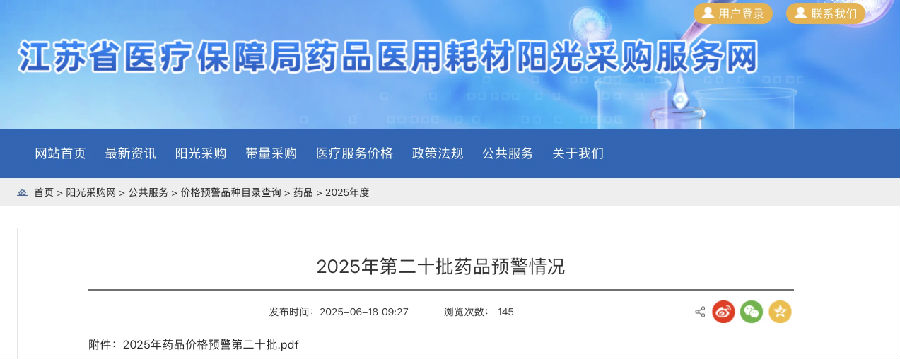 據(jù)賽柏藍(lán)統(tǒng)計,僅6月份,江蘇省就對94個藥品發(fā)出價格預(yù)警,平均一批預(yù)警藥品約24個;2025年以來江蘇省已經(jīng)對649個藥發(fā)出預(yù)警,