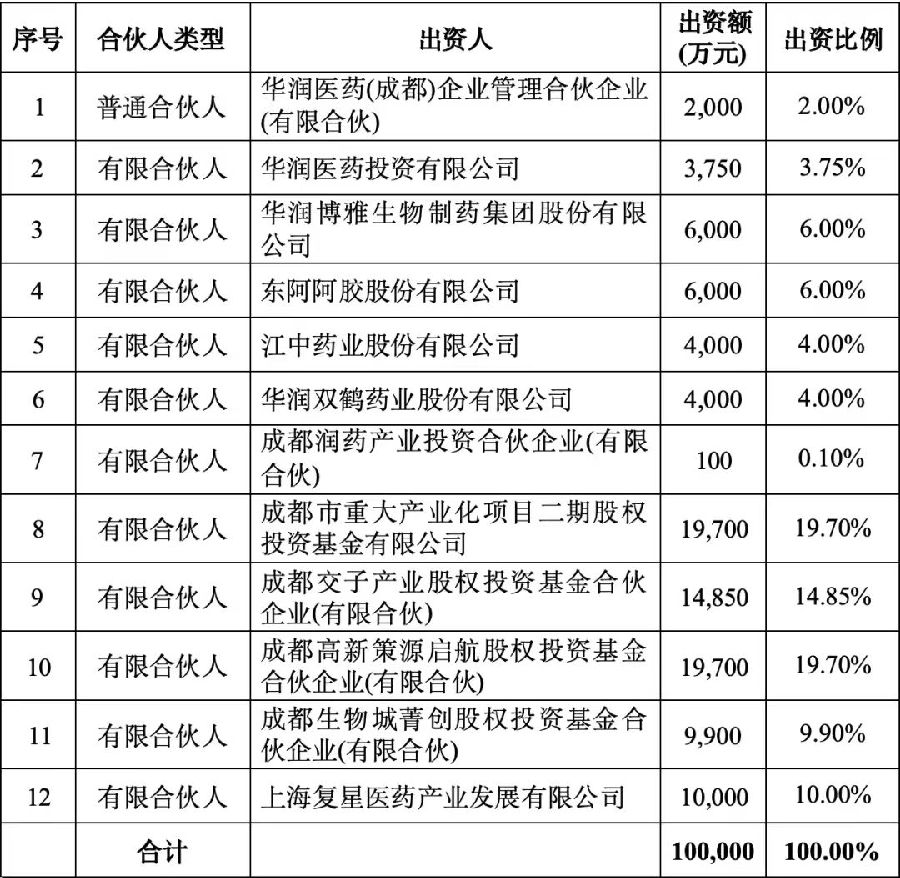 華潤(rùn)系主要上市公司博雅生物、東阿阿膠、江中藥業(yè)、華潤(rùn)雙鶴近日公開了一則與復(fù)星醫(yī)藥、成都國(guó)資合作的消息。 01 瞄準(zhǔn)化學(xué)創(chuàng)新藥、生物藥 中藥滋補(bǔ)等5類企業(yè) 近日,華潤(rùn)醫(yī)藥集團(tuán)股份有限公司(以下簡(jiǎn)稱“華潤(rùn)醫(yī)藥”)發(fā)布公告,宣布旗下多家上市公司將與上海復(fù)星醫(yī)藥產(chǎn)業(yè)發(fā)展有限公司、成都相關(guān)企業(yè)共同設(shè)立華潤(rùn)醫(yī)藥(成都)創(chuàng)新投資基金合伙企業(yè)(有限合伙)。 這是“華潤(rùn)系”醫(yī)藥基金的第二期,擬募集基金規(guī)模達(dá) 10 億元,詳情如下: 圖源:華潤(rùn)雙鶴藥業(yè)股份有限公司 公告稱,預(yù)期基金將主要從事股權(quán)投資、創(chuàng)業(yè)資本及投資管理活動(dòng),主要投資醫(yī)藥及健康產(chǎn)業(yè)以及戰(zhàn)略性新興領(lǐng)域。考慮到成都政府的產(chǎn)業(yè)政策及優(yōu)惠措施,預(yù)期基金將重點(diǎn)投資于化學(xué)創(chuàng)新藥、生物藥( 包括疫苗 )、高端醫(yī)療器械( 包括IVD )、中藥滋補(bǔ)品類、合成生物等領(lǐng)域的企業(yè)以及其他戰(zhàn)略性新興領(lǐng)域的企業(yè)。 從表中可以看出,華潤(rùn)醫(yī)藥(成都)企業(yè)管理、華潤(rùn)醫(yī)藥投資、博雅生物、東阿阿膠、江中藥業(yè)、華潤(rùn)雙鶴等“華潤(rùn)系”公司參投2.575億元,占比25.75%;成都相關(guān)企業(yè)參投6.425億元,占比高達(dá)64.25%;復(fù)星醫(yī)藥1億元,占比10%。據(jù)了解,基金管理人為深圳市華潤(rùn)資本股權(quán)投資有限公司。 10億資金由“三方”共同出資,大大分散了“華潤(rùn)系”單方面投資的風(fēng)險(xiǎn)。值得關(guān)注的是,參投資金最高的成都市重大產(chǎn)業(yè)化項(xiàng)目二期股權(quán)投資基金有限公司和成都高新策源啟航股權(quán)投資基金合伙企業(yè)(有限合伙)均為成都國(guó)資背景,這為“華潤(rùn)系”提供了地方資源和風(fēng)險(xiǎn)緩沖。 一方面,成都國(guó)資背景企業(yè)對(duì)本地產(chǎn)業(yè)和企業(yè)更了解,能篩選出更具潛力和符合地方發(fā)展方向的標(biāo)的;另一方面,地方國(guó)資企業(yè)的深度參與,能幫助“華潤(rùn)系”更好地理解和應(yīng)對(duì)地方性的政策法規(guī)、監(jiān)管要求,降低“華潤(rùn)系”在異地投資中面臨的風(fēng)險(xiǎn)。 02 瞄準(zhǔn)創(chuàng)新領(lǐng)域