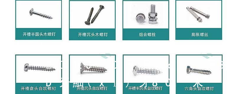 1.機(jī)螺釘 2.自攻螺釘 3.鉆尾螺釘 4.墻板釘 5.纖維板釘 6.木螺釘7.六角木螺釘 8.不脫出螺釘 9.組合螺釘 10.微型螺釘 11.家具螺釘 12.電子螺釘頭型:1.六角頭(hexagon head) 2.六角頭法蘭面(hexagon head with flange) 3. (鐵板牙自攻螺絲) B-2: Plastic Tapping Screw. (塑膠用,自攻螺絲) C: Wooden Screw : 木工螺絲 D: Drywall Screw :水泥墻螺絲 E: Self Drilling Screws鉆尾螺絲(不銹鋼鉆尾螺絲,復(fù)合材料鉆尾螺絲) F:膨脹螺絲,四片膨脹螺絲又