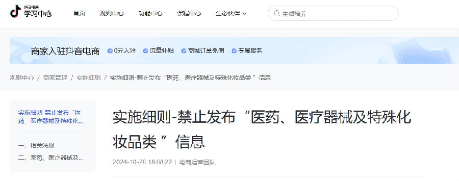 在不久前,抖音電商學習中心還發(fā)布了《實施細則-禁止發(fā)布“醫(yī)藥、醫(yī)療器械及特殊化妝品類 ”信息》。