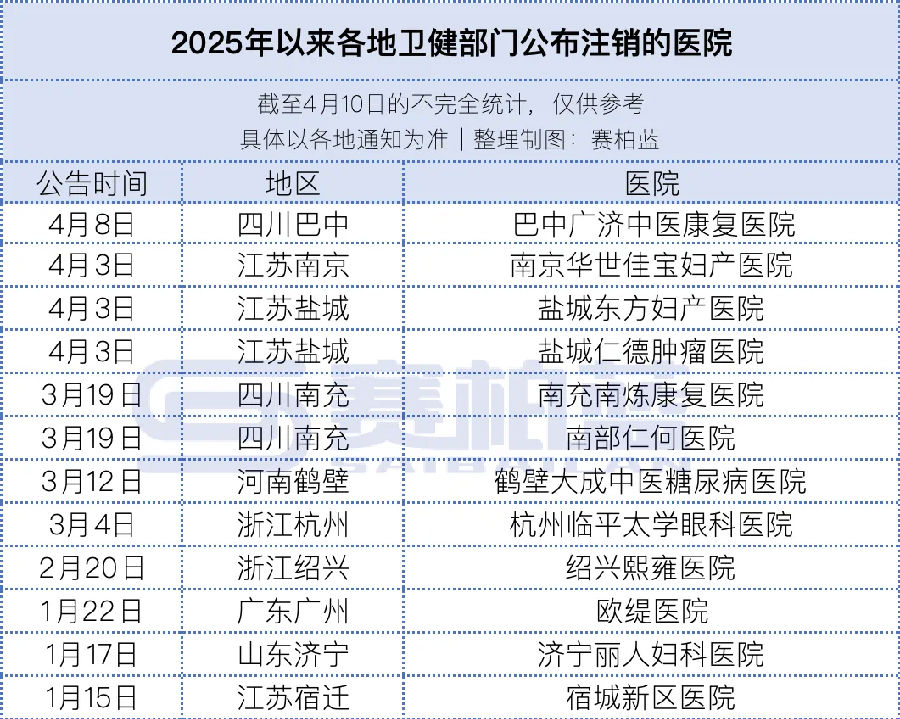 4月3日,江蘇南京市衛(wèi)健委公告,南京華世佳寶婦產醫(yī)院注銷;4月3日,江蘇鹽城市衛(wèi)健委公告,鹽城東方婦產醫(yī)院、鹽城仁德腫瘤醫(yī)院注銷;3月12日,河南鶴壁淇濱區(qū)衛(wèi)健委公告,鶴壁大成中醫(yī)糖尿病醫(yī)院停業(yè)已超1年,予以注銷……浙江杭州、廣東廣州、山東濟寧等多地衛(wèi)健部門也發(fā)布了部分民營醫(yī)院注銷公告。