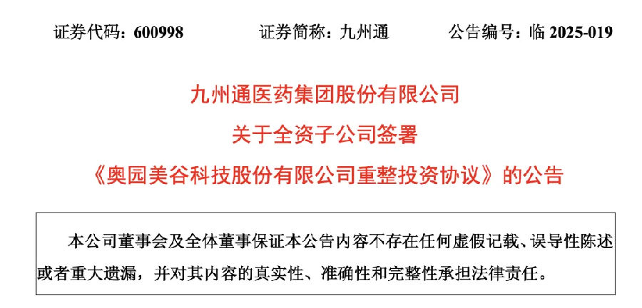 九州通向醫(yī)美領(lǐng)域再邁出一大步。 01 斥資超6億 九州通重整ST美谷 4月23日,九州通發(fā)布公告稱,全資子公司湖北九州產(chǎn)業(yè)園區(qū)運(yùn)營(yíng)管理有限公司(以下簡(jiǎn)稱“九州產(chǎn)投公司”)與奧園美谷及其預(yù)重整期間臨時(shí)管理人簽訂《奧園美谷科技股份有限公司重整投資協(xié)議》,擬出資6.73億元取得重整后奧園美谷3.6億股轉(zhuǎn)增股票。 賽柏藍(lán)查詢發(fā)現(xiàn),奧園美谷目前無實(shí)際控制人,第一大股東深圳奧園科星投資有限公司的持股數(shù)為1.72億股。如果此次重整計(jì)劃順利完成,九州產(chǎn)投公司有望成為ST美谷控股股東。 九州通認(rèn)為,此次重整投資將對(duì)其醫(yī)美等業(yè)務(wù)產(chǎn)生積極影響,符合長(zhǎng)期戰(zhàn)略發(fā)展規(guī)劃,有利于增強(qiáng)核心競(jìng)爭(zhēng)力。ST美谷醫(yī)美服務(wù)業(yè)務(wù)與其醫(yī)美業(yè)務(wù)具有良好的協(xié)同效應(yīng)。 作為曾經(jīng)因醫(yī)美概念股價(jià)暴漲6倍的明星企業(yè),ST美谷前身是于1996年上市的湖北金環(huán),早期主要從事化纖行業(yè);而后被京漢控股收購;2020年,奧園集團(tuán)入主并更名為奧園美谷,大步進(jìn)軍醫(yī)美行業(yè)。 為了加快構(gòu)筑醫(yī)美產(chǎn)業(yè)上下游的業(yè)務(wù)優(yōu)勢(shì),奧園美谷通過并購醫(yī)美機(jī)構(gòu)迅速切入這一賽道,包括以6.97億元收購盛妝醫(yī)美持有的浙江連天美企業(yè)管理55%的股權(quán),切入中游醫(yī)美服務(wù)賽道;而后其全資子公司廣州奧美又與暨大醫(yī)藥生物中心、暨源生物等簽署戰(zhàn)略合作協(xié)議,進(jìn)軍醫(yī)美產(chǎn)品端等。 如今,ST美谷旗下?lián)碛泻贾葸B天美醫(yī)療美容醫(yī)院、杭州維多利亞醫(yī)療美容醫(yī)院、廣東奧若拉健康管理咨詢有限公司;其下設(shè)有醫(yī)美事業(yè)部,近年來醫(yī)美業(yè)務(wù)增長(zhǎng)迅速,業(yè)務(wù)范圍已覆蓋全國10000余家醫(yī)美服務(wù)機(jī)構(gòu)。 但ST美谷在大力開拓“美麗新事業(yè)”的同時(shí),交出的業(yè)績(jī)并不如人意。根據(jù)ST美谷業(yè)績(jī)預(yù)告,2024年預(yù)計(jì)虧損3.2億元至4.5億元,歸屬于上市公司股東的凈資產(chǎn)為-1.2億元至-2.4億元。 2025年4月,湖北證監(jiān)局發(fā)布公告,對(duì)奧園美谷采取出具警示函的行政監(jiān)管措施。2024年11月18日,奧園美谷的一位債權(quán)人廣州律建財(cái)稅咨詢有限公司向湖北省襄陽中院申請(qǐng)對(duì)其進(jìn)行重整及預(yù)重整,理由是其“未能清償?shù)狡趥鶆?wù),且已明顯缺乏清償能力但具有一定的重整價(jià)值”。 ST美谷深陷退市風(fēng)險(xiǎn)與債務(wù)危機(jī)的雙重困境。 不過,奧園美谷重整仍然引起行業(yè)的廣泛參與。在其臨時(shí)管理人下發(fā)出招募重整投資人、公開選聘審計(jì)和評(píng)估機(jī)構(gòu)的通知后,截至2025年1月3日,共有45家(以聯(lián)合體形式報(bào)名算作1家)意向投資人提交報(bào)名材料并足額繳納報(bào)名保證金,其中含14家具備產(chǎn)業(yè)相關(guān)背景。 三個(gè)月后,九州產(chǎn)投公司參與ST美谷重整。這一交易頗具誠意,九州產(chǎn)投公司按照產(chǎn)業(yè)投資人的投資價(jià)格受讓奧園美谷本次轉(zhuǎn)增的股票,受讓標(biāo)的股份價(jià)格為1.87元/股。這一價(jià)格相較于ST美谷4月23日收盤價(jià)3.73元/股,基本是打了對(duì)折。 02 加碼醫(yī)美賽道 實(shí)現(xiàn)業(yè)務(wù)協(xié)同 在醫(yī)美領(lǐng)域,九州通主要專注于醫(yī)美細(xì)分行業(yè)市場(chǎng),提供醫(yī)美專屬藥品和耗材“一站式”采購服務(wù)。 醫(yī)美是九州通發(fā)展的重要業(yè)務(wù)之一,2023年醫(yī)美業(yè)務(wù)增長(zhǎng)態(tài)勢(shì)強(qiáng)勁,實(shí)現(xiàn)銷售收入3.42億元,較上年同期增長(zhǎng)103.06%,實(shí)現(xiàn)醫(yī)美業(yè)務(wù)覆蓋5714家醫(yī)美機(jī)構(gòu),線上活躍客戶達(dá)到1864家。2024年上半年,九州通產(chǎn)品戰(zhàn)略發(fā)展事業(yè)部上半年開展了近70個(gè)項(xiàng)目的調(diào)研工作,包括醫(yī)美。 九州通在醫(yī)美領(lǐng)域的發(fā)展,不僅僅是財(cái)務(wù)投資,還有與投資標(biāo)的達(dá)成戰(zhàn)略合作,依托自身優(yōu)勢(shì)助力標(biāo)的開拓市場(chǎng)的同時(shí),實(shí)現(xiàn)實(shí)現(xiàn)自身業(yè)務(wù)增長(zhǎng)。 這一點(diǎn)早在2016年九州通對(duì)愛美客的投資上就得到了驗(yàn)證。2016年9月,九州通出資3082.56萬元參與愛美客增資。通過這筆投資,九州通收益頗豐。2021年上半年九州通超過21億元的凈利潤(rùn)中,投資收益貢獻(xiàn)過半,其中投資A股醫(yī)美龍頭愛美客產(chǎn)生的計(jì)入當(dāng)期的損益就達(dá)到11.49億元。 不僅如此,九州通下屬企業(yè)九州通醫(yī)療器械集團(tuán)與華熙生物達(dá)成戰(zhàn)略合作,雙方依托九州通在國內(nèi)藥品零售市場(chǎng)雄厚的基礎(chǔ)和健全的網(wǎng)絡(luò)等為華熙生物推進(jìn)“未來醫(yī)美共生聯(lián)盟”市場(chǎng)戰(zhàn)略作出努力。 “顏值經(jīng)濟(jì)”火熱,根據(jù)行業(yè)數(shù)據(jù)分析,我國醫(yī)療美容市場(chǎng)早在2023年已經(jīng)超過2000億元。 回到本次合作,九州通稱,如本次重整成功,其將利用自身強(qiáng)大的醫(yī)藥供應(yīng)鏈體