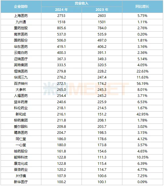 從營(yíng)收規(guī)模來(lái)看,超100億元的醫(yī)藥企業(yè)有48家,超5成正增長(zhǎng)。上海醫(yī)藥、九州通兩家千億營(yíng)收龍頭繼續(xù)領(lǐng)跑,重藥控股、南京醫(yī)藥、國(guó)藥股份均超過(guò)500億元。值得一提的是,與2023年相比,3家跌出百億營(yíng)收梯隊(duì)。