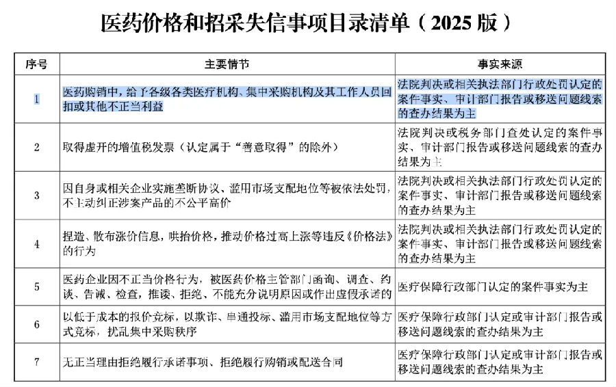 新版醫(yī)藥價格和招采信用評價的操作規(guī)范將開始執(zhí)行。 01 信用評價升級 破除帶金銷售、商業(yè)賄賂... 今年第三季度,《醫(yī)藥價格和招采信用評價的操作規(guī)范(2025版)》將正式實施,醫(yī)藥行業(yè)監(jiān)管進入新階段。 國家醫(yī)保局對價格招采信用評價制度進行修訂,主要是為了破除商業(yè)賄賂、帶金銷售等不正當行為,嚴厲打擊醫(yī)藥購銷領域違法違規(guī)的亂象。 不久前,北京市醫(yī)保局發(fā)布一則藥企致歉聲明,涉事企業(yè)承認其業(yè)務代表在推廣過程中存在“給予不正當利益”的行為,已解除與涉事人員的合作關系,并承諾終止失信行為。 類似案例并非孤例。賽柏藍梳理發(fā)現(xiàn),四川、云南等地此前也多次發(fā)布藥企致歉公告,部分醫(yī)藥銷售人員因違規(guī)推廣被開除,一些藥企的致歉與醫(yī)藥價格和招采信用失信等級評定結果有關。 國家醫(yī)保局于6月5日發(fā)布《關于進一步完善醫(yī)藥價格和招采信用評價制度的通知》(以下簡稱《通知》),新規(guī)主要從四個維度強化監(jiān)管,包括拓展案源信息,提高評價效能;簡化失信等級并收緊評價標準;提高失信成本,強化處置力度;鼓勵企業(yè)主動糾正,規(guī)范了操作流程。 《通知》加大向生產企業(yè)穿透力度,評價處置原則上穿透至上市許可持有人。涉及醫(yī)保部門工作人員行賄或國家集采圍標串標的,直接按“特別嚴重失信”處理。 對于評定為“特別嚴重失信”的生產企業(yè),應限制或中止該企業(yè)全部藥品和醫(yī)用耗材掛網、投標資格,同時限制或中止其涉案產品在所有省份的掛網、投標資格;對于評定為“特別嚴重失信”的配送企業(yè),將限制或中止其在評價省份的配送資格5年。 主要修訂內容如下: 同時,新發(fā)布的《醫(yī)藥價格和招采失信事項目錄清單(2025版)》明確,“醫(yī)藥購銷中,給予各級各類醫(yī)療機構、集中采購機構及其工作人員回扣或其他不正當利益”均屬失信行為。 根據國家醫(yī)保局通知,截至2024年底,評定失信企業(yè)735家,其中“特別嚴重”失信企業(yè)7家、“嚴重”失信企業(yè)40家、“中等”失信企業(yè)76家、“一般”失信企業(yè)612家。一些失信企業(yè)在信用評價制度下,根據失信程度不同受到相應程度的失信處置,不少企業(yè)通過合理降低虛高價格等措施進行了信用修復、糾正失信行為。 02 多部門聯(lián)動 合力整治 帶金銷售的本質是通過商業(yè)賄賂手段獲得短期利益,但長期會破壞醫(yī)藥行業(yè)生態(tài)。除國家醫(yī)保局外,近期已經有不少部門出臺相關政策,合力整治醫(yī)藥領域商業(yè)賄賂問題。 國家市場監(jiān)管總局發(fā)布《醫(yī)藥企業(yè)防范商業(yè)賄賂風險合規(guī)指引》,列出32項“禁止”,明確了多個高風險場景,如學術拜訪、業(yè)務接待、折扣折讓等,要求企業(yè)建立合規(guī)內控機制。并要求醫(yī)藥企業(yè)作為第一責任人,建立反商業(yè)賄賂合規(guī)體系,并鼓勵內部舉報機制。 同時禁止醫(yī)藥代表和醫(yī)療器械學術推廣人員以直接或間接方式給予醫(yī)療衛(wèi)生人員財物或其他不正當利益,促使其開具醫(yī)藥產品處方或推薦、使用、采購醫(yī)藥產品等。醫(yī)藥代表一旦存在商業(yè)賄賂記錄,將面臨嚴厲處罰。 6月5日,國家藥監(jiān)局、財政部、市場監(jiān)管總局發(fā)布《關于對藥品醫(yī)療器械質量安全內部舉報人舉報實施獎勵的公告(2025年第41號)》,與一般舉報相比,內部舉報具有信息詳實準確、專業(yè)性強、可信度高等特點,立案比例高、查實比例高,發(fā)現(xiàn)重大風險隱患的可能性大。