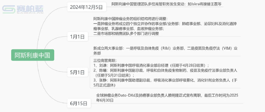 據(jù)賽柏藍不完全統(tǒng)計發(fā)現(xiàn),僅半年時間左右,阿斯利康中國至少已經(jīng)進行了3次架構(gòu)調(diào)整,最近的一次是5月1日,阿斯利康中國新設(shè)呼吸及自體免疫(R&I)業(yè)務(wù)部和疫苗及免疫療法(V&I)業(yè)務(wù)部。同時,部分高管變動。具體如下: