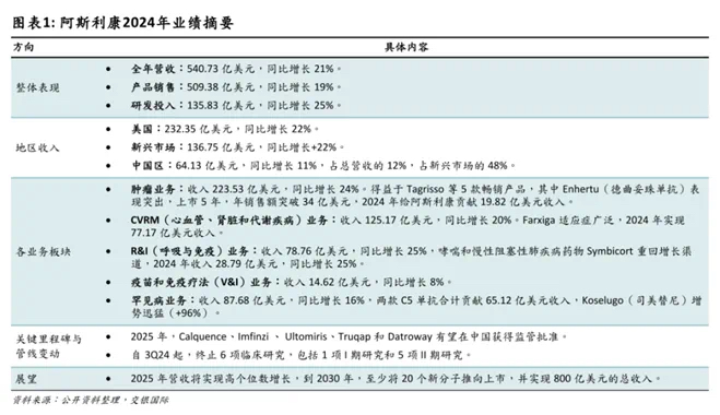 作為阿斯利康第一大業(yè)務(wù)板塊,腫瘤業(yè)務(wù)營收占2024年產(chǎn)品總收入的41%,為223.53億美元(+24%)。這主要得益于多款抗腫瘤藥物的穩(wěn)定增長,如Tagrisso(奧希替尼)、Imfinzi(度伐利尤單抗)、Calquence(阿可替尼)、Lynparza(奧拉帕利)、Enhertu(德曲妥珠單抗),同比增速均超過10%。