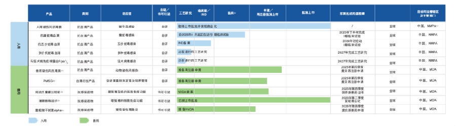 此外,其利用低風(fēng)險、高效率的技術(shù)復(fù)用能力,形成了人用藥和獸用藥的協(xié)同產(chǎn)品組合,獸用管線包括獸用破傷風(fēng)抗毒素、孕馬血清促性腺激素(「PMSG」),以及若干用于補(bǔ)充或支持PMSG治療的激素類藥物;還引進(jìn)了三款新獸藥(獸用抗感染藥物)管線的生產(chǎn)及商業(yè)化的權(quán)限,進(jìn)一步豐富產(chǎn)品布局。這雙飛輪模式下的產(chǎn)品管線面對的均是有明確市場缺口、且體量持續(xù)增長的市場。